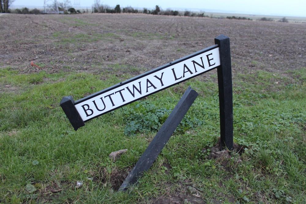 Buttway lane Sign at Cliffe before being (un)fixed by Tim.